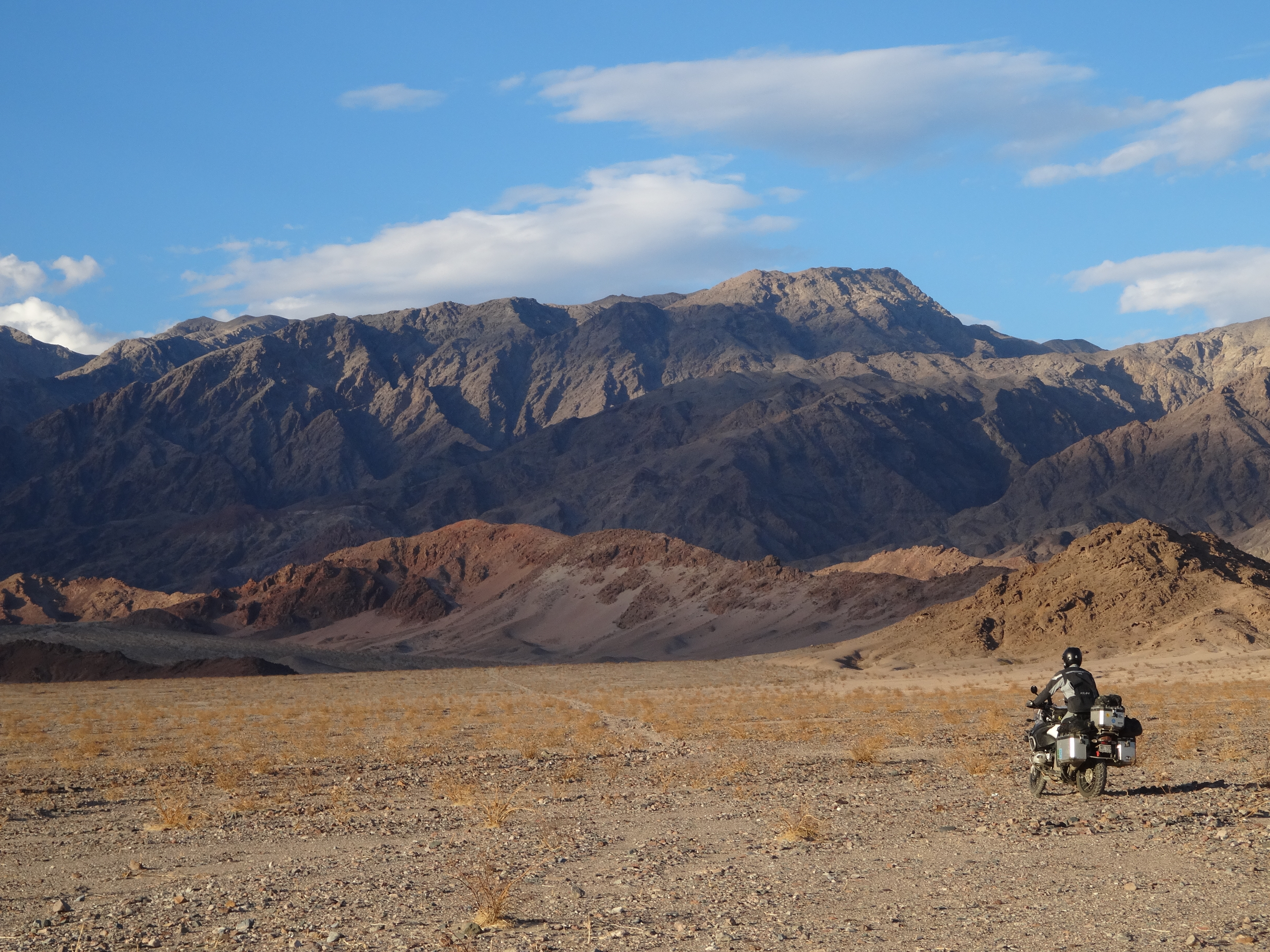 It was 96 degrees at 6:30pm when we started to set up camp in Furnace Creek. There were way more mountains then I thought there would be and way more people than I thought there would be in Death Valley. We humored ourselves and stopped by the Furnace Inn to see about a room. Rooms there start at $360 a night. Tonight we will be tenting. We set up the tent jumped on the bike and headed to the Saloon for some A/C, drinks and dinner. The place was packed. We enjoyed $6 beers and $16 burgers which were mediocre at best. Seems like everything is overpriced in Death Valley. When we got back to camp even the whiskey was too warm to really enjoy. It was still in the upper 90’s when we laid down to sleep. It was the first time we used the tent without the rain fly. The stars were amazing. Temps got down to about the upper 70’s. Too hot to even make coffee the next morning. By far the warmest I have ever camped. If we were to do again we would have drove through Death Valley earlier in the day and camped just outside the park in Panamint Springs. This would have saved us some money on food, drinks, park fees and camping fees.