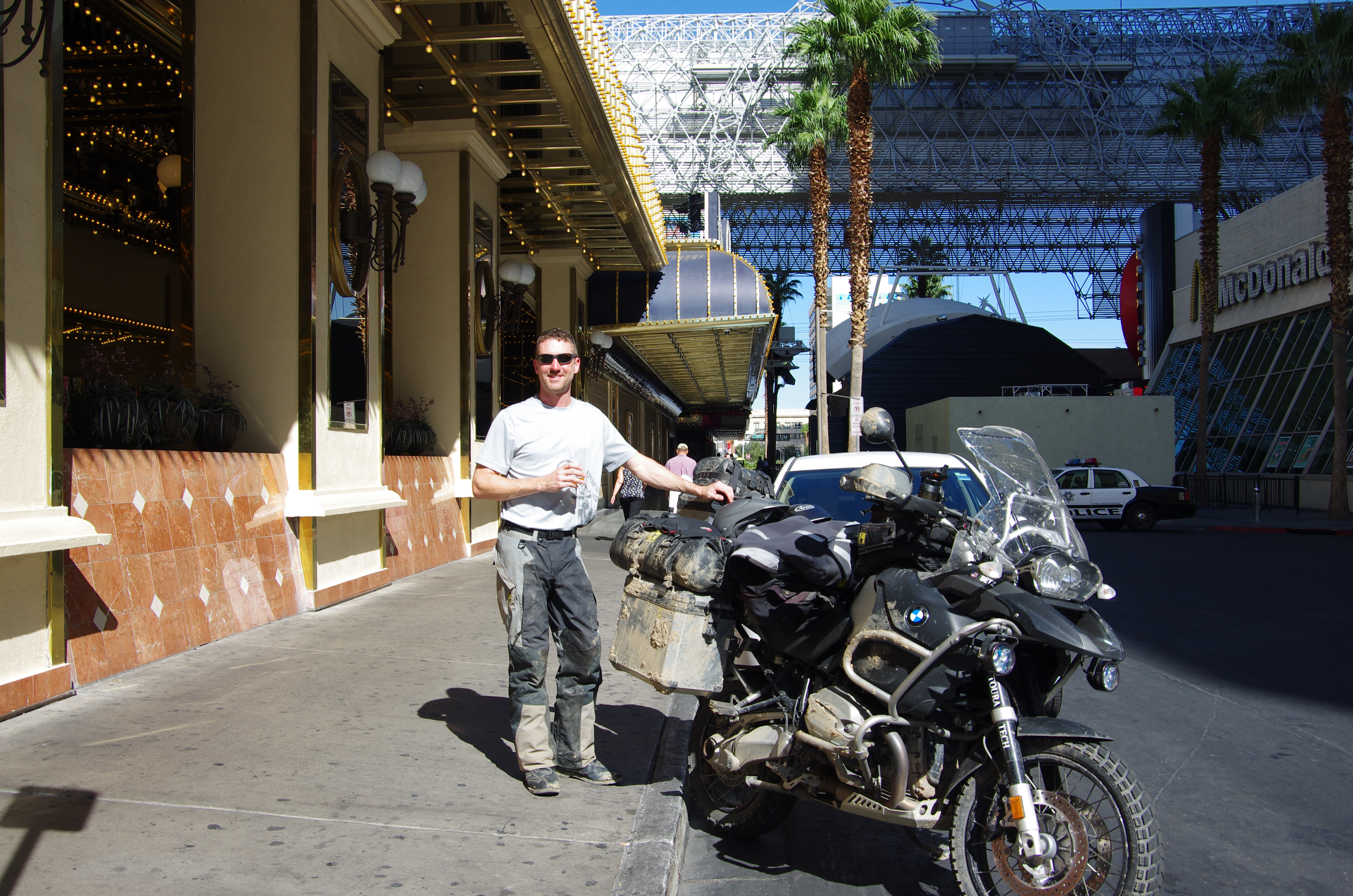 The day started with a good breakfast at the Coral Hills Best Western. We slabed it to Vegas. Ran down the strip. It has changed a lot in the last 14 years which was the last time I was there. I actually flew to Vegas with one of my best friends for Spring Break my Senior year of college and this was my first trip back. Galen showed me where the Convention Center was located which hosts the International Builder Show that he attended the last few years. Found a “Welcome to Vegas” sign and got a good pic with the bike. This was located in the middle of two roads. We waited for the police officer to get a green light and drive off before Galen jumped the curb for this photo.