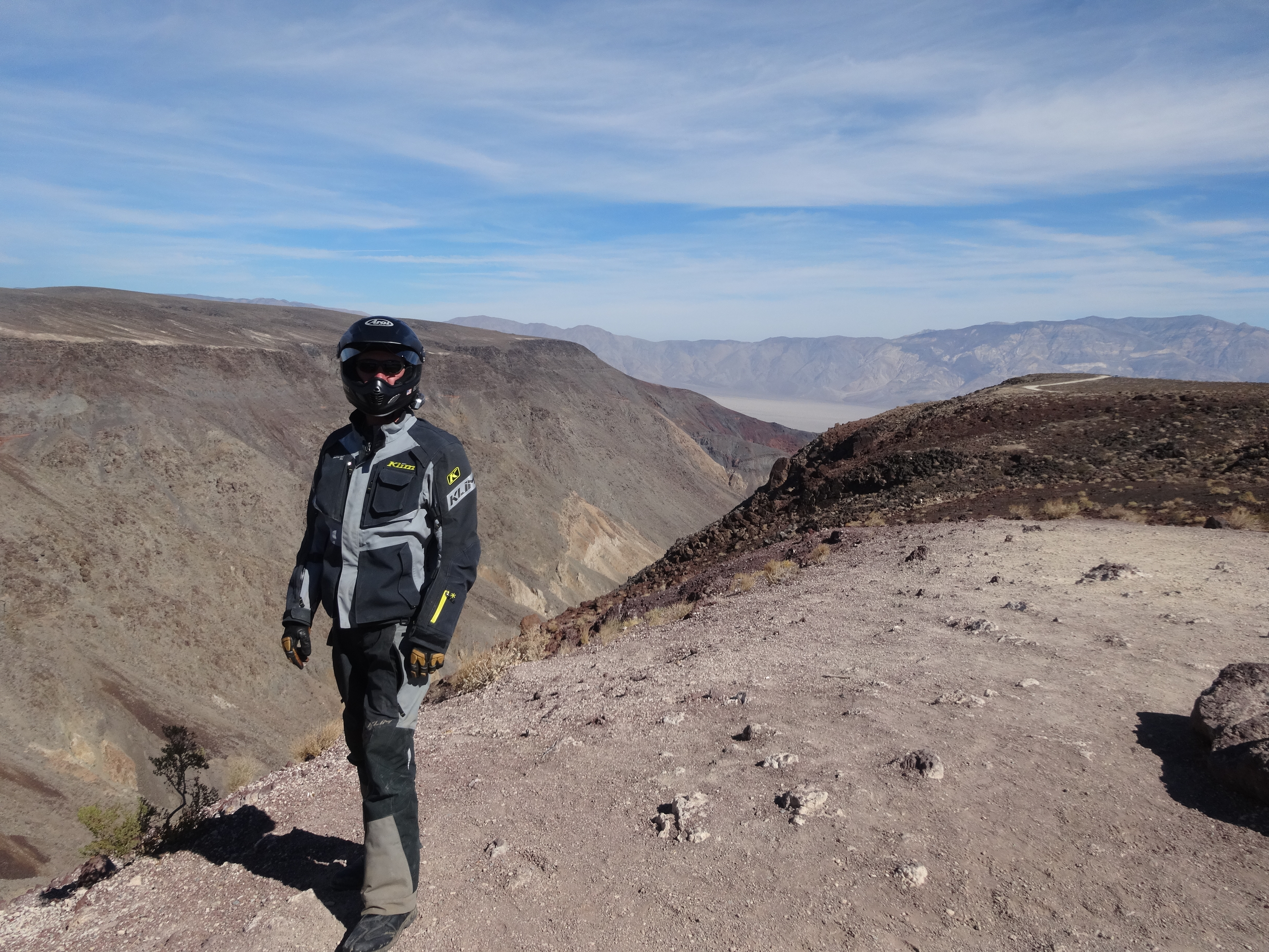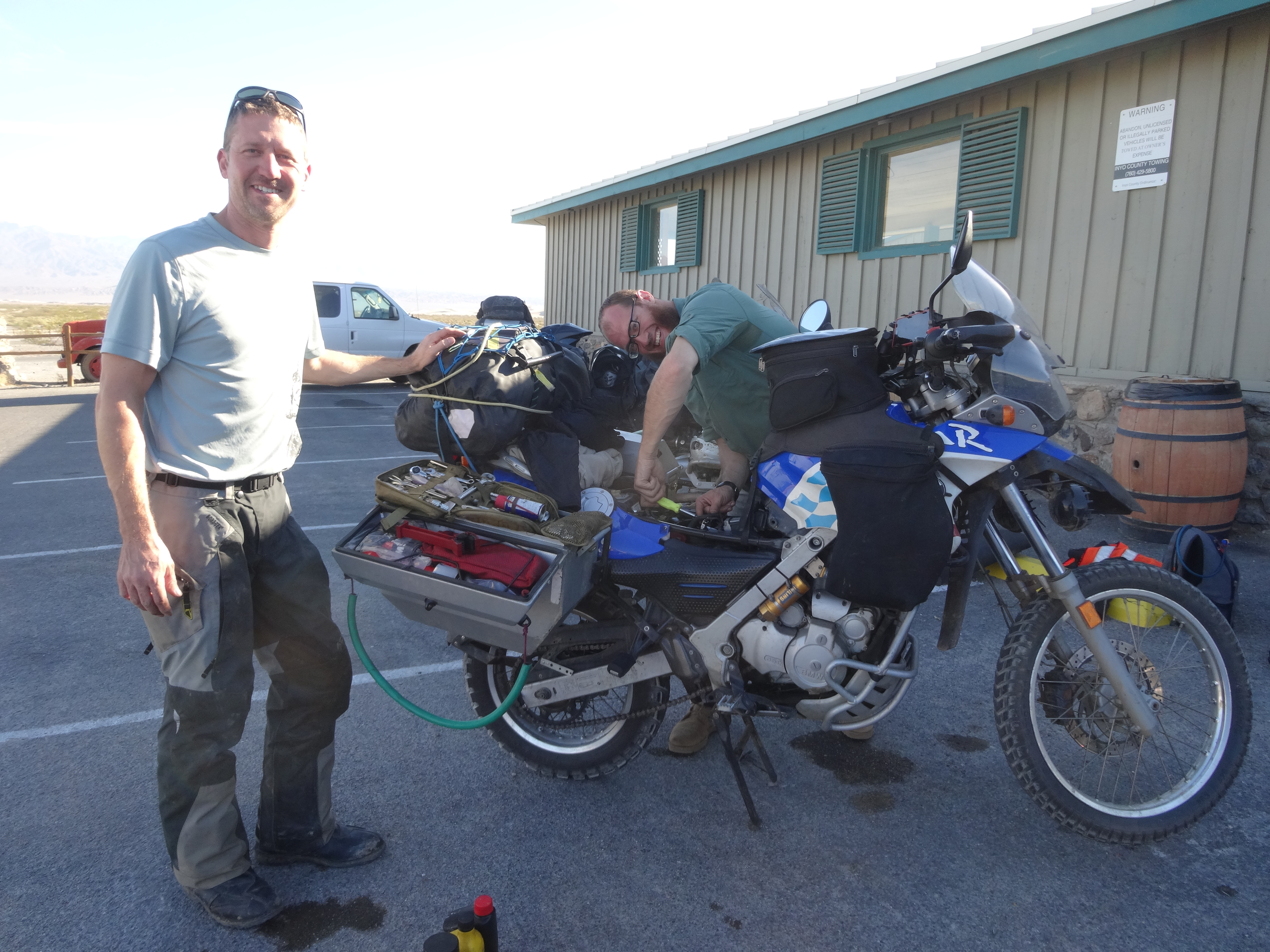 It was in the mid 80’s when we packed up the bike. Too hot for coffee and we wanted to get on the road before it warmed up. We made it 20 miles down the road in Stovepipe Wells we saw a fellow adventure rider working on his bike. We stopped and met Nate Waybrant who was headed to Argentina. He was riding a BMW Dakar 650. His fuel line was deteriorating. We could smell the gas when we pulled up. He was in the process of cutting the end of the hose and reconnecting an area with less cracks. Super cool guy originally from Michigan he had already been to Alaska on this trip. He seemed like he had it covered and we headed on. You can follow his travels on his Delmore page.