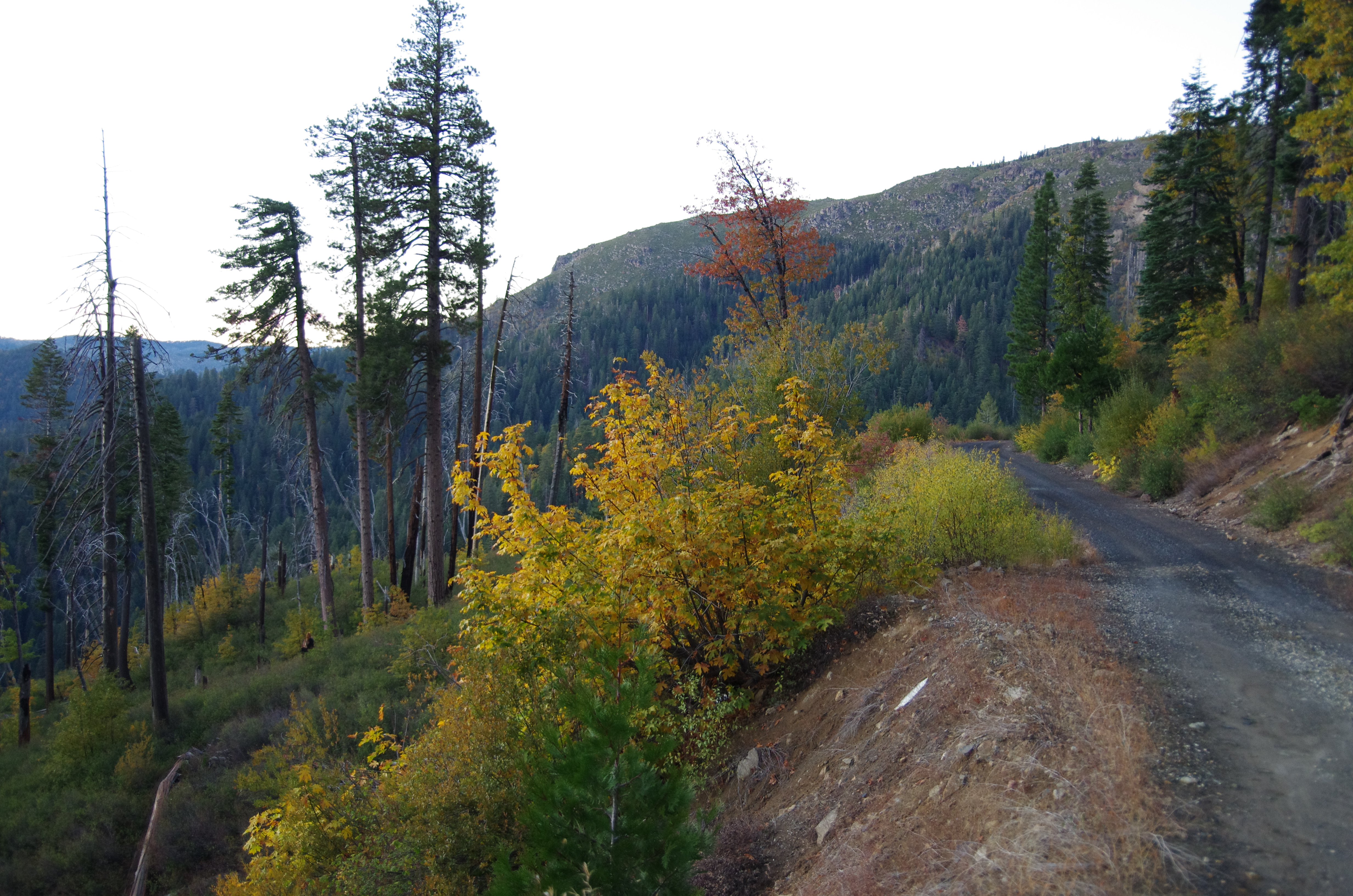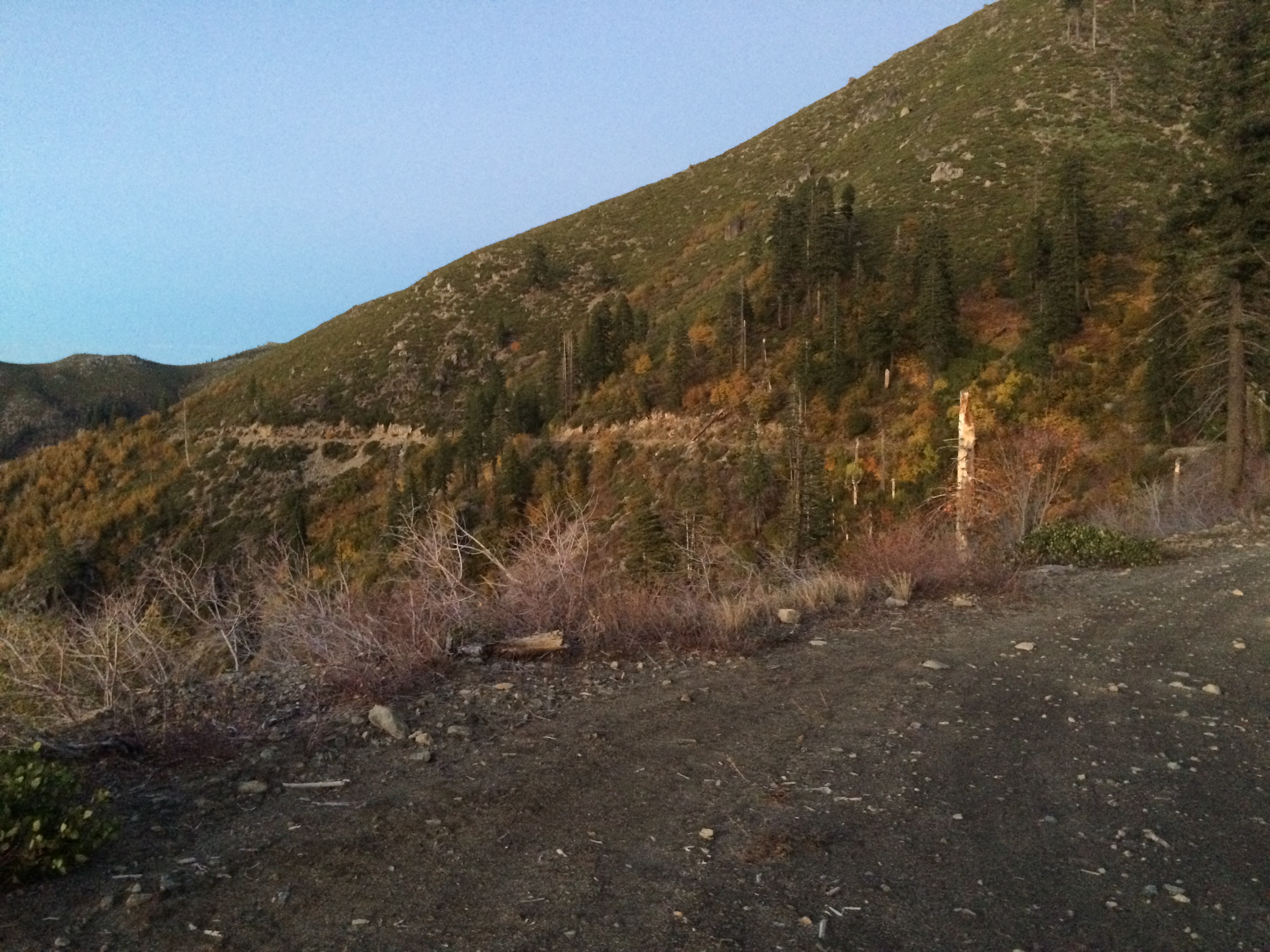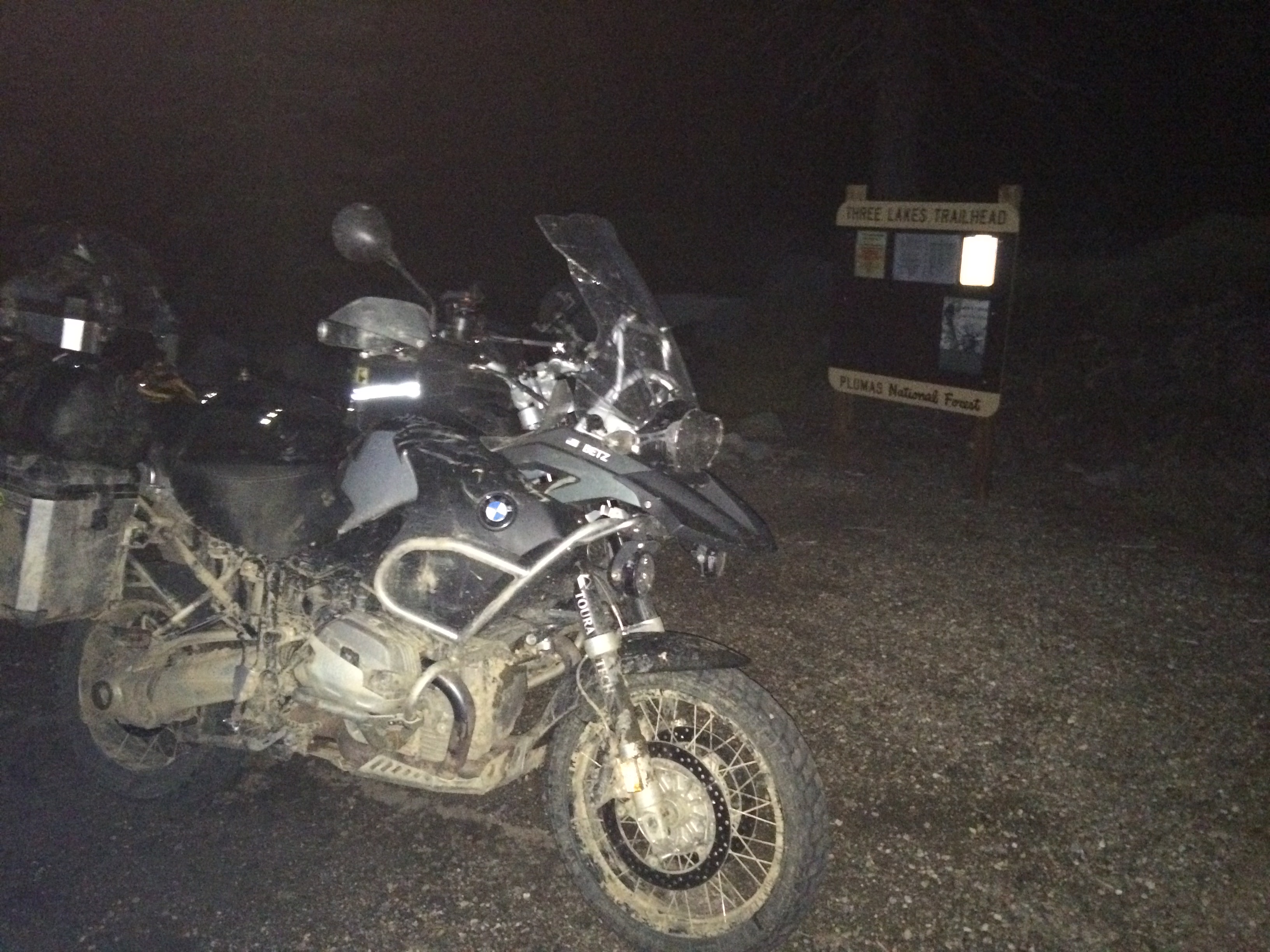 In Quincy we filled up with fuel and ask the locals about Three Lakes. Chad from Adventure Designs had mentioned that he enjoyed camping at Three Lakes. The locals pointed us in the right direction but warned us it was going to get cold at that elevation. Lodging in Quincy didn’t look great from the reviews on Trip Advisor so we took a chance and headed to Bucks Lake. Temperature was dropping. We came to a Lakeshore Resort which had a restaurant and bar. We stopped in and found out they were serving food until 8pm but bar would be open until after the Worlds Series game. They had cabins but didn’t rent them out for just one night. The next place up the road that rented cabins was pretty rough but they would be willing to let us stay one night. The folks at the bar suggested we try the bed and breakfast where we would probably have the place to ourselves since it was middle of the week and off season. We motored up the street to the next place. The owner and her friend where outside decorating for Halloween. We asked if we could see the cabin. They were out of propane until later in the week so only one cabin had electric heat. She was asking $100 for the night so Galen and I took a peek. I took one step in and walked out. I would rather camp in freezing weather then stay there. Calling it a little rough was an overly generous description. So up the road we went to the bed and breakfast which was called Haskins Valley Inn. Dawn and her parents are the owner. She also owned the general store and she was getting ready to close up at 6pm. We got there just in time. Galen negotiated her down to $110 but she wouldn’t go any further. The temperature kept dropping and I thought the bed and breakfast was a much better option than camping. We took it. We unloaded all of our items. Galen still really wanted to go up to Three Lakes where Chad mentioned he loved to camp. I wasn’t in the mood for a hero section so late in the day and I was concerned we would miss our window for dinner at the restaurant. I asked if he could dropped me off at the bar so I could watch the last game of the World Series and I could order us food before the kitchen closed. He agreed and dropped me off. With the bike much lighter he could make much better time. The locals didn’t understand why Galen wanted to go to Three Lakes because it had been drained earlier in the year. Of course we didn’t know that, so Galen was in for a surprise. The hours ticked by. No cell service always makes me a little nervous. It got dark. I ordered a wrap because the kitchen was closing. The bar emptied out after Kansas City had lost the World Series game and still no Galen. Two guys at the bar who had way too much to drink said they would stay until Galen got back because they had trucks and could go get him if necessary. Not much longer Galen pulled up. Turns out he took a wrong turn and that is what caused the delay. We spilt the wrap and he shared about his adventure. The road was fine up to the last 4 miles. It got rough but still doable. He was shocked it was empty but got some pictures.