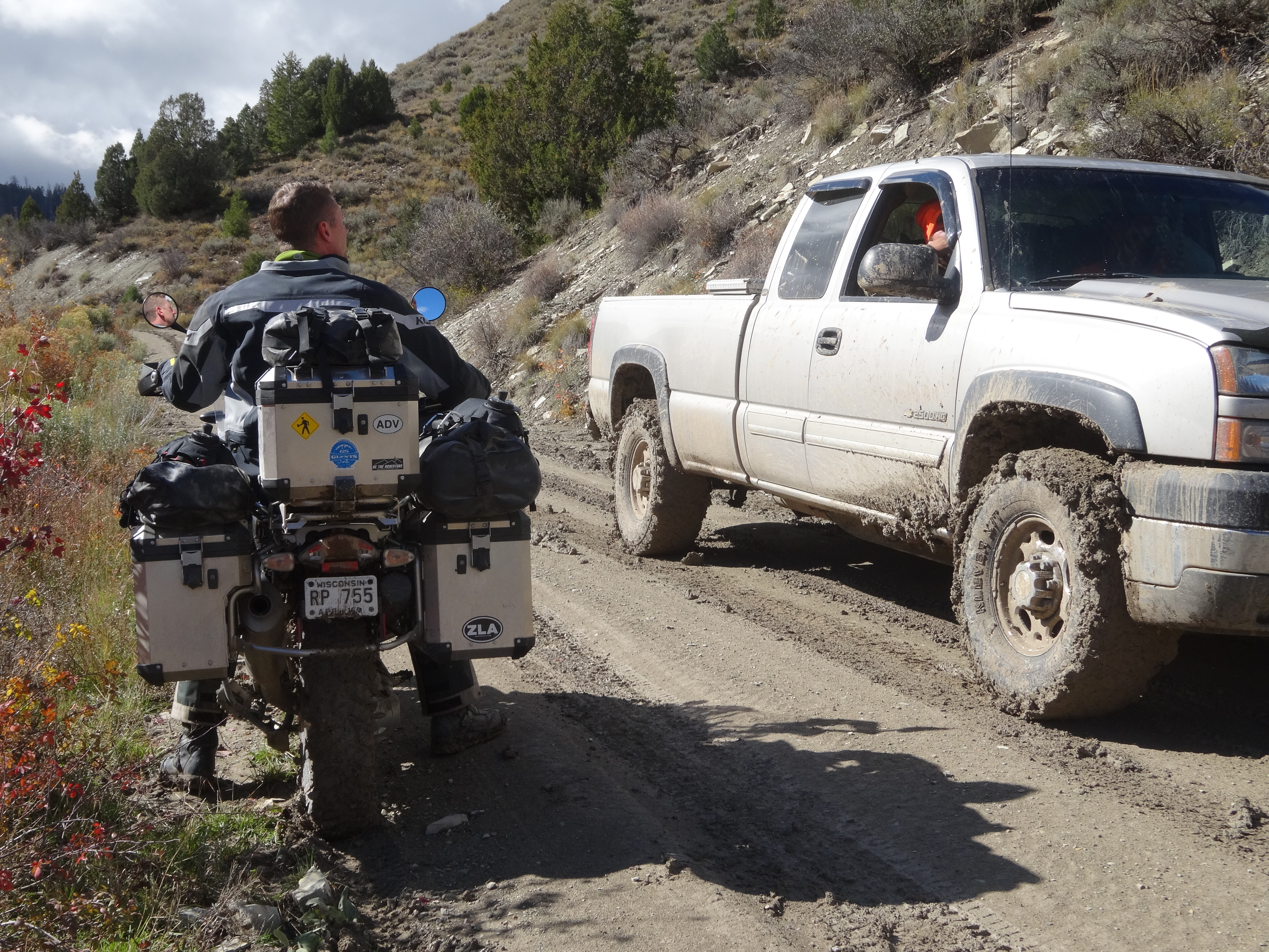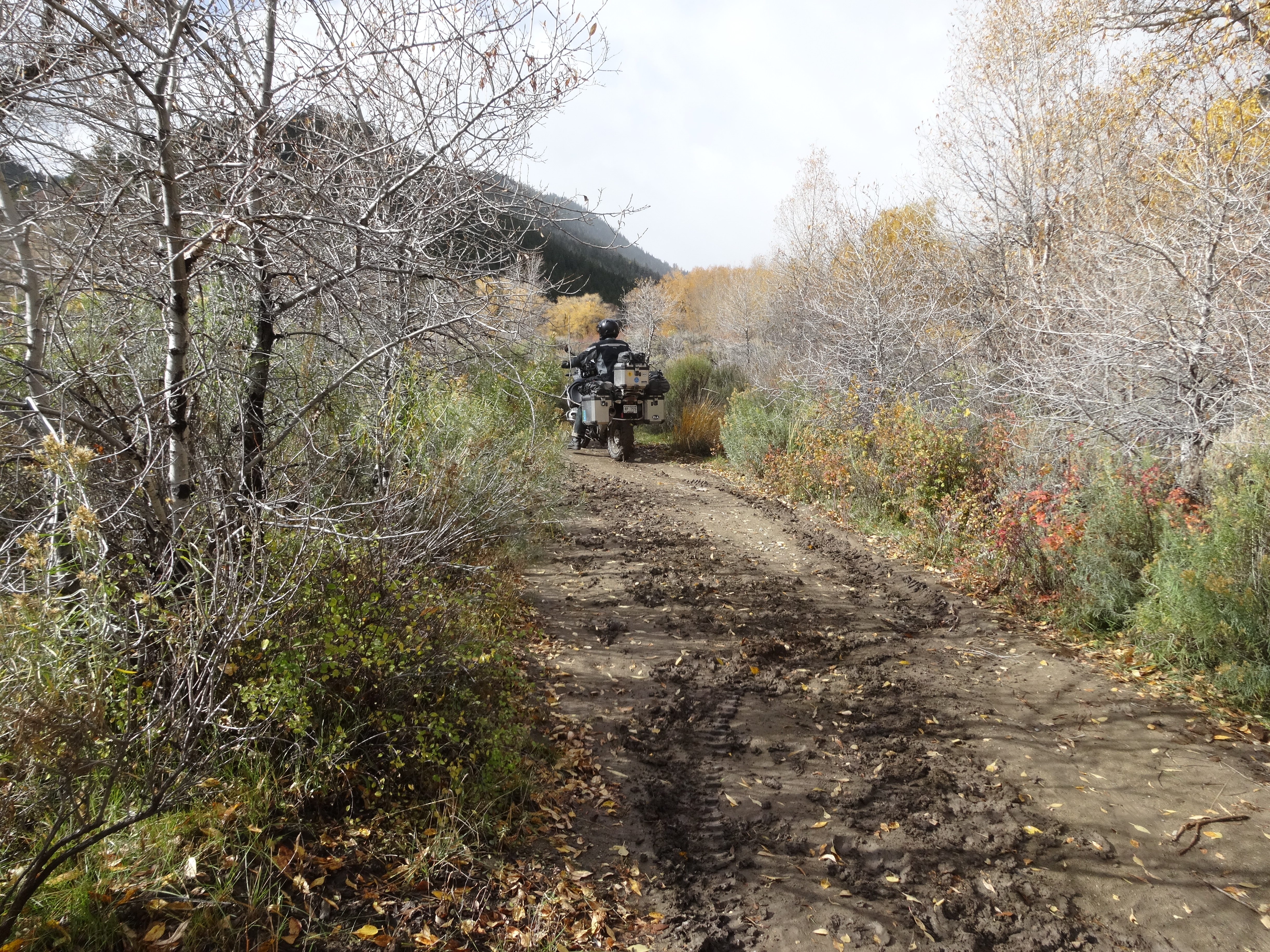 We turned off on trail 168 and the ruts were deep and the soil was like grease. We doubled back to 148 and talked to some hunters. Two hunters said no way not possible in the current condition to get through to Highway 6. Chained up trucks weren’t making it. One Hunter said if you can make it past the next two hills we would be fine. Galen thought we should give a try. We made through the next three hills with little issue. Of course it was crazy greasy but by then the sun came out and the clay just got tacky and started to load up the fenders so much so that it locked the front wheel. We cleaned it out best we could but after only a couple of feet it would lock up again. We made the decision to turn back.