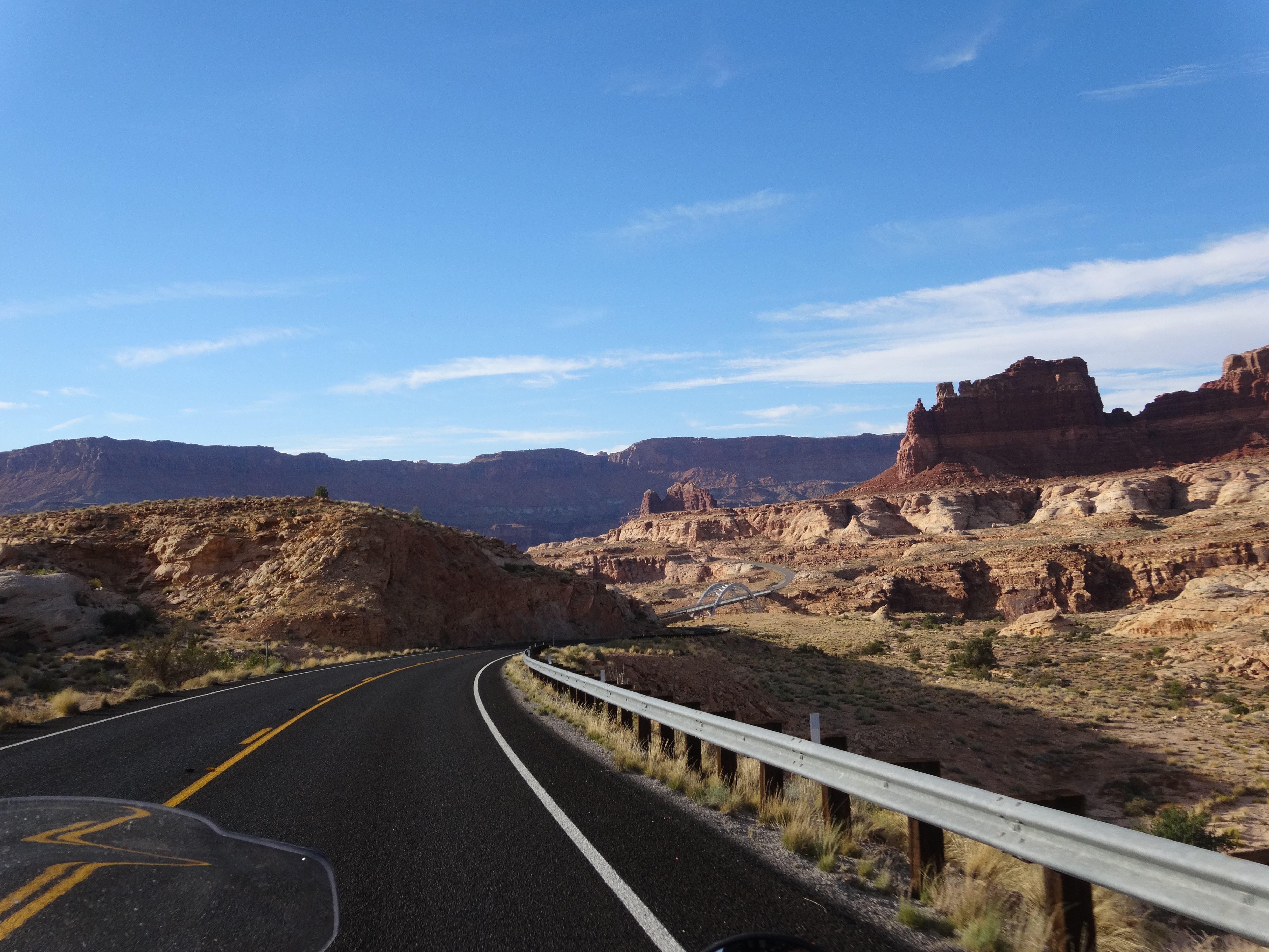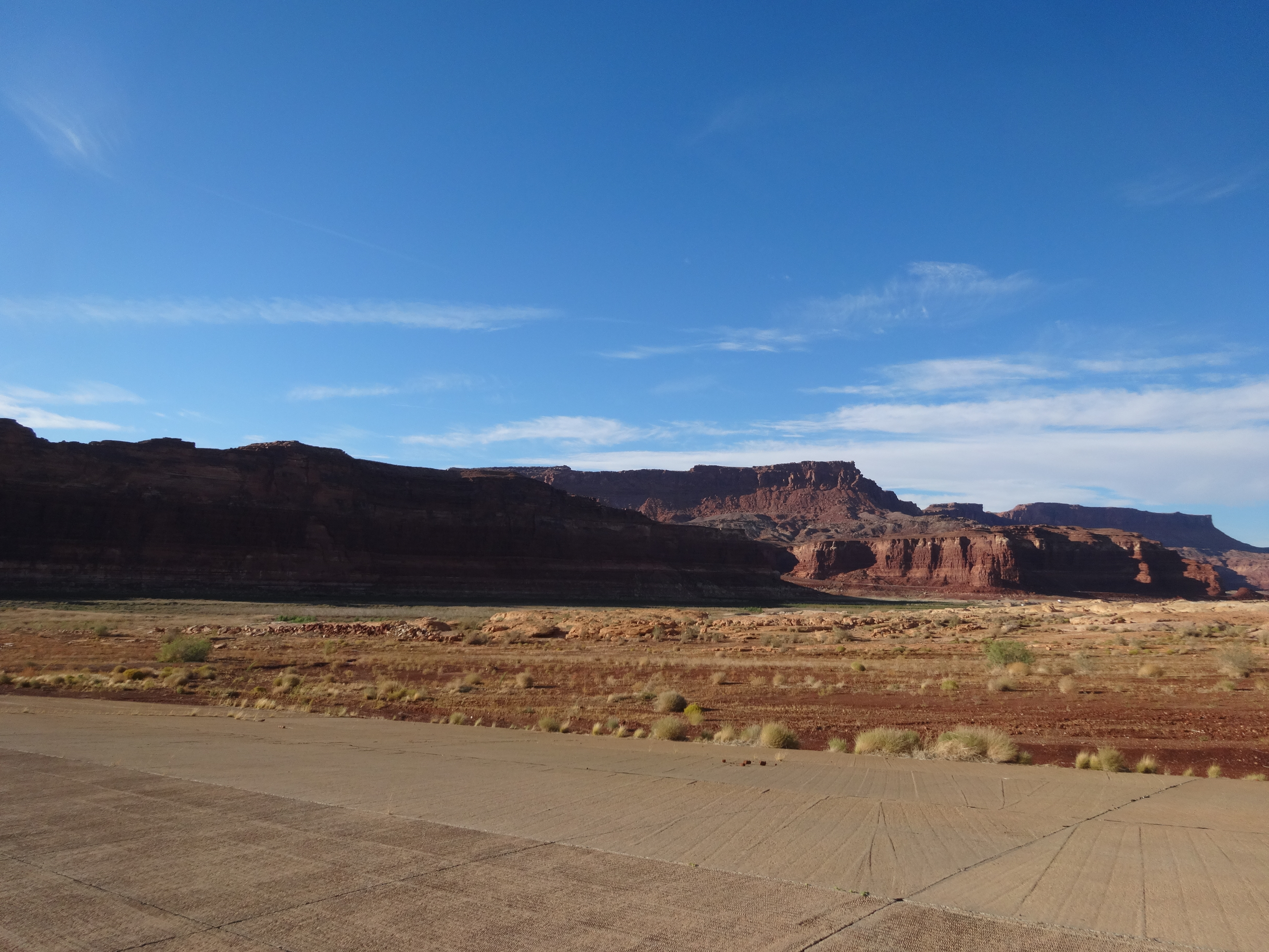 We were on blacktop most of the rest of the day. Galen and I were so surprised just how beautiful Hwy 95 turned out to be. Neither of us had any idea just how gorgeous this part of Utah would be to ride through. For a blacktop road it was full of fantastic views. We saw very little traffic as we entered Glen Canyon. We knew we would be camping tonight and started to look for a place. We turned into Hiute. It showed camping and a Maria on the map. We thought we were on the North side of Lake Powell but what we found was straight up eerie. This part of the lake had dried up. The boat launch went to no where. The beautiful bathroom facilities were closed. There was no one there. Yes, there were picnic tables but it was so wide open. The little Marina had been long closed. We double checked the map. Two more tents noted on the map in the next hour so we kept moving.