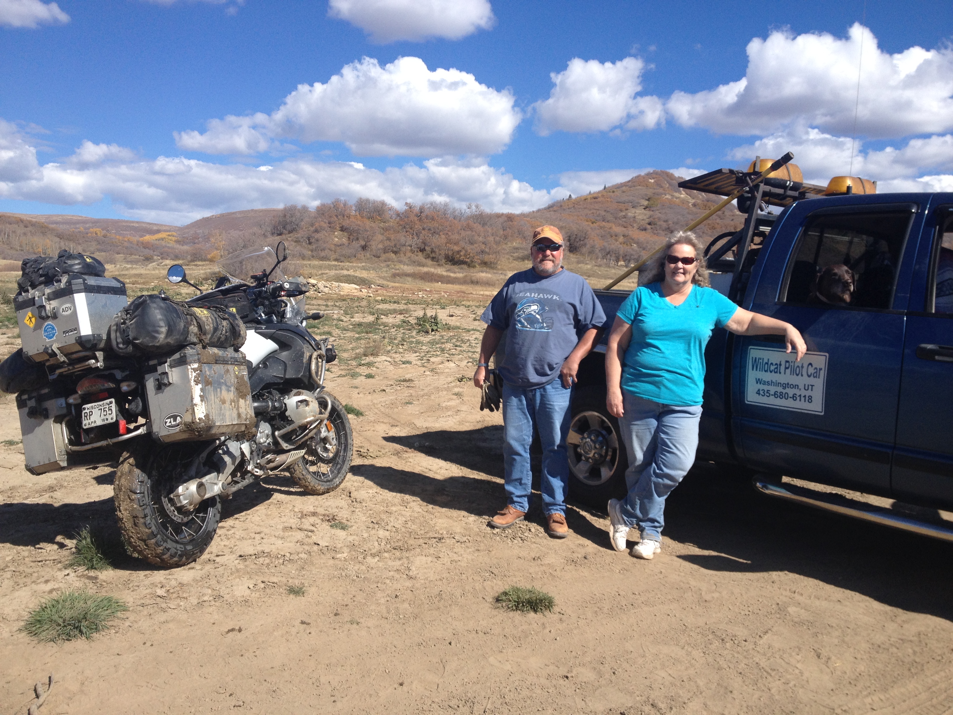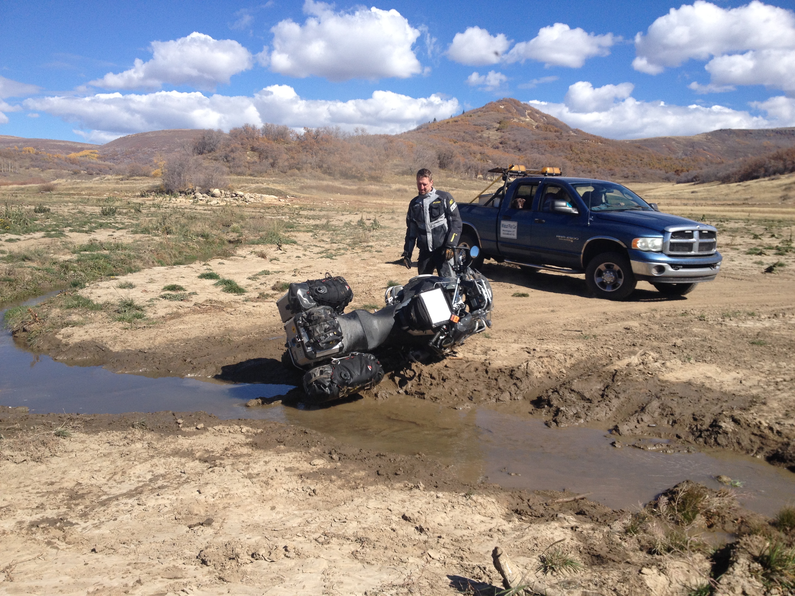 We followed the tracks to a water crossing. It looked all innocent. Much bigger drop off than you could see from our angle. Front tire of the bike dug in and the bike went down. The both of us and the bike were covered in mud. The mud was so greasy under the water that Galen couldn’t get his footing. A couple in a truck were not too far away and saw it all happen. They came over and the guy helped us get the bike up and pull it out.